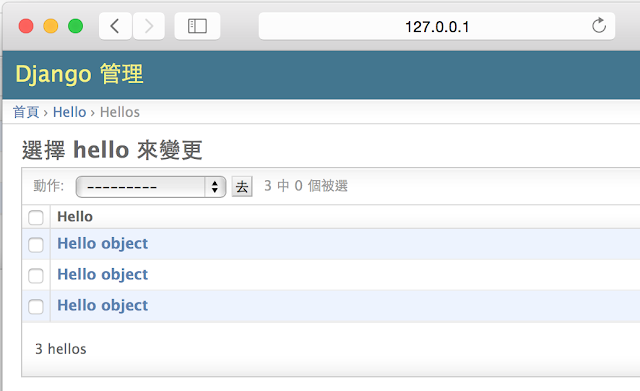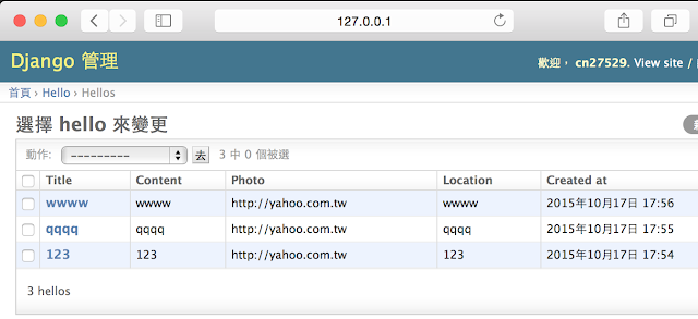 建立好資料表格後,我們常常會利用admin的管理功能來新建資料或修改資料內容,因為這樣是比較快速的,以Django shell 我總覺慢了一大拍XD。
